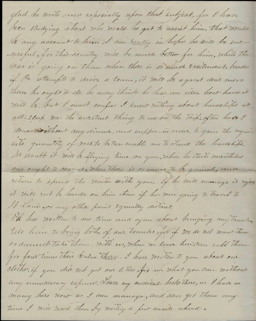 I received two letters from your last mail—one, for myself, and one for brother [George]. They were both dated January 10th. I was very anxious to get them, for your letter the week previous was not satisfactory. You had just returned from your trip to Sedalia and I feared you was sick, which your last letter proved to me. I am in hopes you are not dangerously ill [and] that you will recover soon. I shall be uneasy about you though until I hear better. You are exposing yourself too much for a man of your age. You will soon be on the delinquent list if you do not take care of yourself. I had rather hear of your selling the cattle and depending upon brother and I for your support, than to see you work as hard for we are now plenty able to do so.
