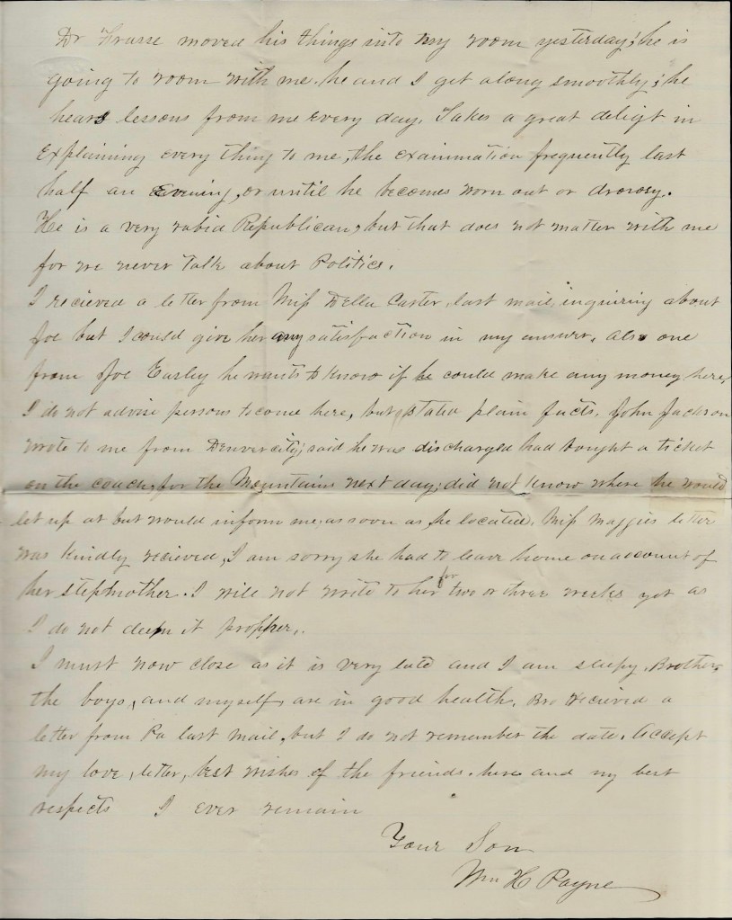 These letters were written by William (“Willie”) Henry Payne (1840-1914), a native of Shelbyville, Kentucky. He was born on 2 March 1840 and came to Harrisonville, Cass county, Missouri, with his father, a cabinet maker named Winchester Payne, and family, when three years old. In 1850 the family moved to property on East Pearl Street in Harrisonville. Willie was married in September 1865 to Elizabeth Endres of Santa Fe, New Mexico. The couple returned to live in Harrisonville for a time but then relocated to Nebraska where Willie was engaged in the lumber business. He died there in 1914.