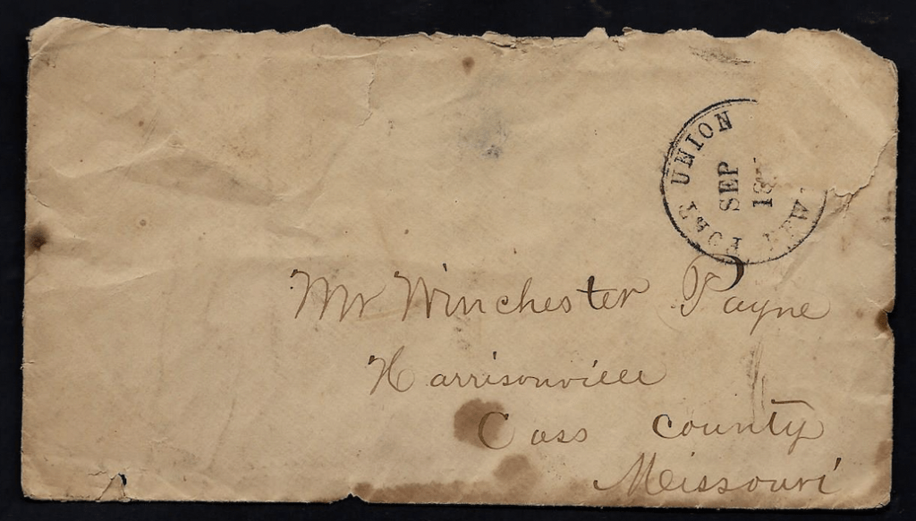 Cass County histories inform us that Winchester Payne was loyal to his southern heritage and supported the Confederacy. Local Union troops knew he was “secesh” an targeted his farm frequently when foraging. In the summer of 1862 alone it is reported that they took 28 hogs, 50 bushels of corn, and a ton of hay off his farm despite his having previously taken the Loyalty Oath. Things did not get any better in 1863 when General Ewing issued General Order No. 11 expelling Southern sympathizers from their homes in Cass county. It is reported that the Payne family moved temporarily to Boone county. These letters confirm that Winchester continued to look for alternative employment outside of the region despite his ailing health. They also suggest that several Cass county acquaintances had found employment at the military post or in Santa Fe while in exile from Missouri.