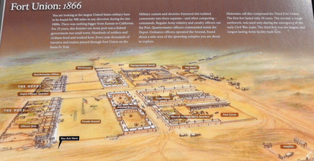 Willie’s letters were all written from Fort Union—a military post on the Santa Fe trail in New Mexico which was begun in 1851 to provide security along the trail as well as serving as a depot to other smaller forts. Work on the large Fort Union complex pictured below was started in August 1862, the structures constructed with adobe bricks set on stone foundations. They included officers quarters, enlisted men’s barracks, corrals, warehouses, a hospital, and other structures. Little of the complex remains today.