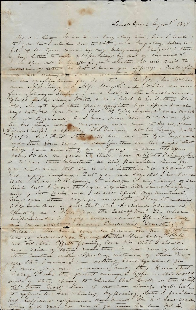 The whole neighborhood is angry at me almost. The Stevenson’s were  insulted because Charles wrote “something” to William. The blame was all thrown on me who was as innocent as  “our dog Watch.” Then Sally Poke has told the Offutt’s family some lie that I should have said of them and there is not one of them that ventures within speaking distance of me. All this, however, I care nothing scarcely about for I know my own innocence and they knew that Sally Poke was the greatest enemy I had in the world and if they choose to believe that “snake in the grass,” let them do it There is no one living better able to appreciate her whining hypocrisies than I for I have had sufficient experiences. Dear knows she has sent word time and again for me to go and see her but I treat her invocations with that perfect contempt which they so richly merit.