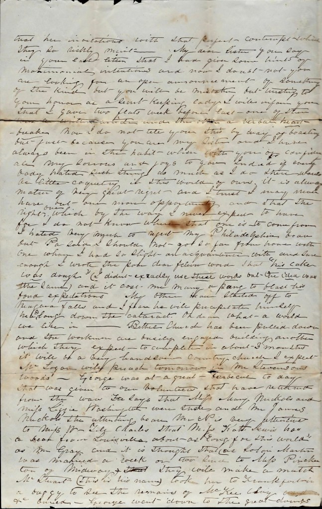 George was at a great barbecue today that was given to our Volunteers that have returned from the [Mexican] War. He says that Miss Mary Nuckols and Miss Lizzie Washington were there and Mr. James Nuckols. The attending beau, Mr. Nuckols, is very attractive to Miss Washington. Tell Charles that Miss Kate Lewis has a beau from Louisville about as “long for this world” as Mr. Gray and it is thought that (as Solon Martin was married a week or two since to Miss [Catherine Harriett] Pinkerton of Midway) 3 they will make a match. Mr. Stuart (this is his name) took her to Frankfort in a buggy to see the remains of McKee Ivy, &c. buried. George went down to the great doings on that occasion and Pa gave all the negroes holiday. Susan Dolan went down and I as I generally do, staid at home.