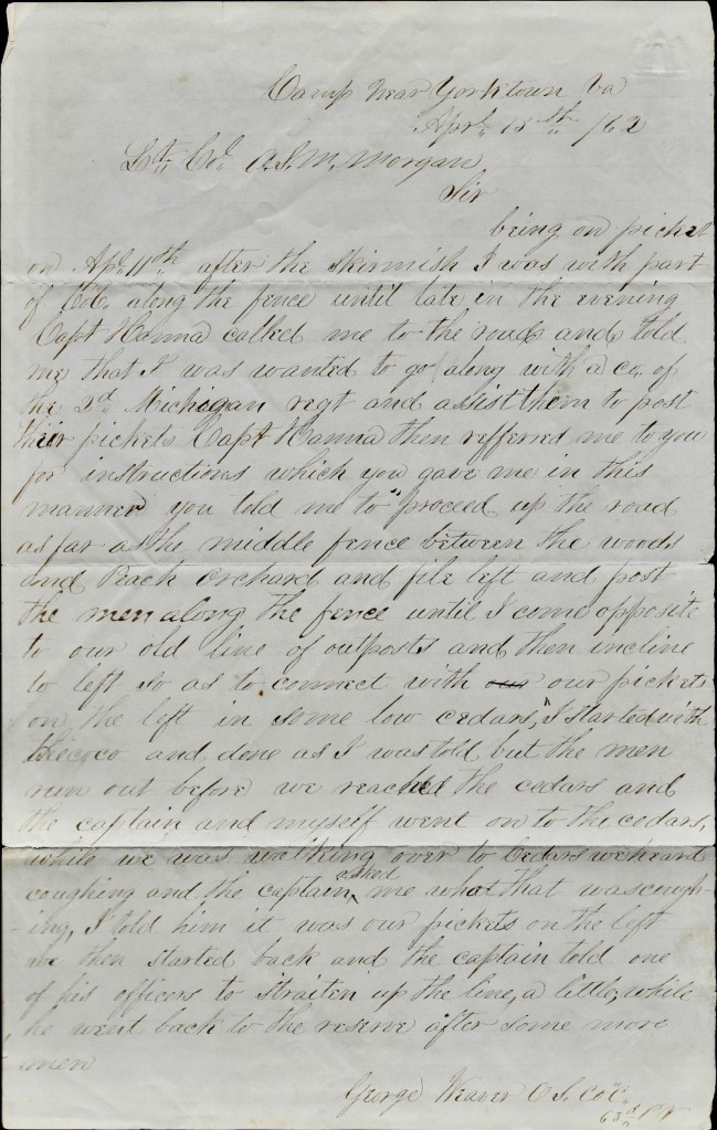 Sir, being on picket on April 11th after the skirmish, I was with part of Co. C along the fence until late in the evening, Capt. [Jason R.] Hanna called me to the road and told me that I was wanted to go along with a company of the 2d Michigan Regt. and assist them to post their pickets. Capt. Hanna then referred me to you for instructions which you gave me in this manner. You told me to “proceed up the road as far as the middle fence between the woods and peach orchard and file left and post the men along the fence until I come opposite to our old line of outposts and then incline to left so as to connect with our pickets on the left in some low cedars.”