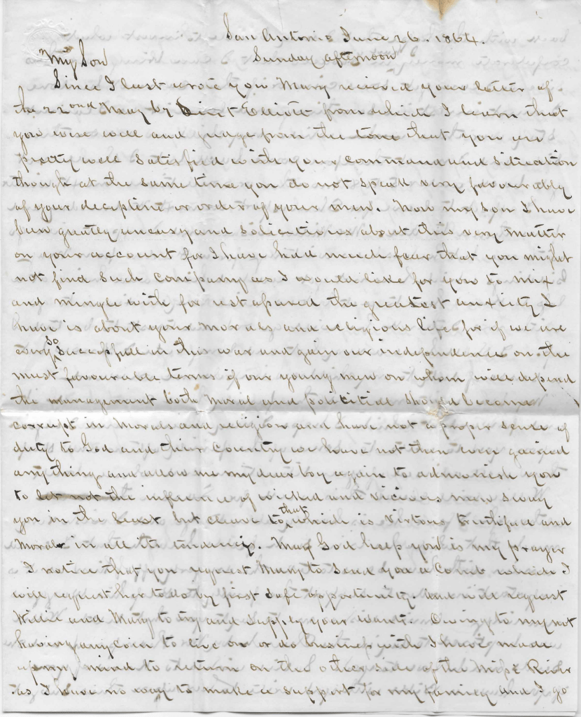 Willie will leave this week for Loredo although I fear he is hardly able to go and I wish very much that while he is in such feeble health that I could remain with him so as to take the drudgery off of him as it is important in order to support the family to keep his wagons running. Annie wishes me to say to you that little Willie was baptized today in the church by Mr. Thompson and she sends love to you. Sallie wishes to know of you if you have a Bible with you. Write to her upon this subject and encourage her in the deep solicitude and anxiety she has for you. She certainly is a very affectionate sister and daughter and nothing she could not do or sacrifice that she would not do for her Father, brothers or sisters. And too, my son, you are blessed in a dear sister (Mary) for her heart is deeply and warmly engaged for you but really we all are for our soldier boy now fighting for our defense and protection.