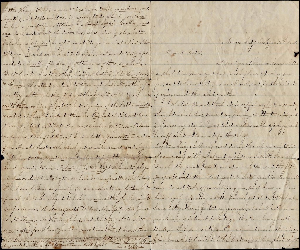 My time being wholly engrossed during the week, my only time of conversing with my absent friends is Sabbath evening. I make it a point to write one or two each time, and thought proper to write the eldest first so sister, your turn has just come. Do not take offense, I pray you, for I know you have been eagerly expecting a letter from me, yet I don’t think I have altogether forfeited my promise. I shall not have much news of interest to write you this time, having written to Mary Lib 1 so recently, and my acquaintances in the place being somewhat limited. The best news I have [is] that we all enjoy good health, but was we permitted to converse personally, I would say a great deal which I cannot through this silent medium. And little Harry keeps talking to me all the while, wishing me to let him write to his Aunties.