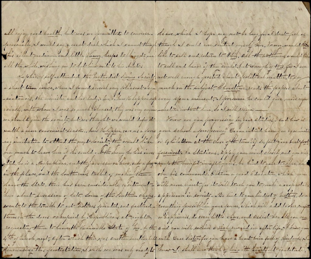 Sophie & self attended the Methodist Sewing Society a short time since where I formed several very pleasant acquaintances. The [Methodist] minister and his lady—Mr. [Michael T.] and Mrs. [Prudence J.] Klepper especially—with whom I was so much pleased. 2 They was very anxious we should join the society but we thought we would defer it until a more convenient season. Mrs. Klepper gave us a pressing invitation to attend the next Society. They would like very much to leave here if he could get the money he has invested. He is a Republican and they are very scarce here—only a few in the place—and the Southerners talked of making them leave the State.