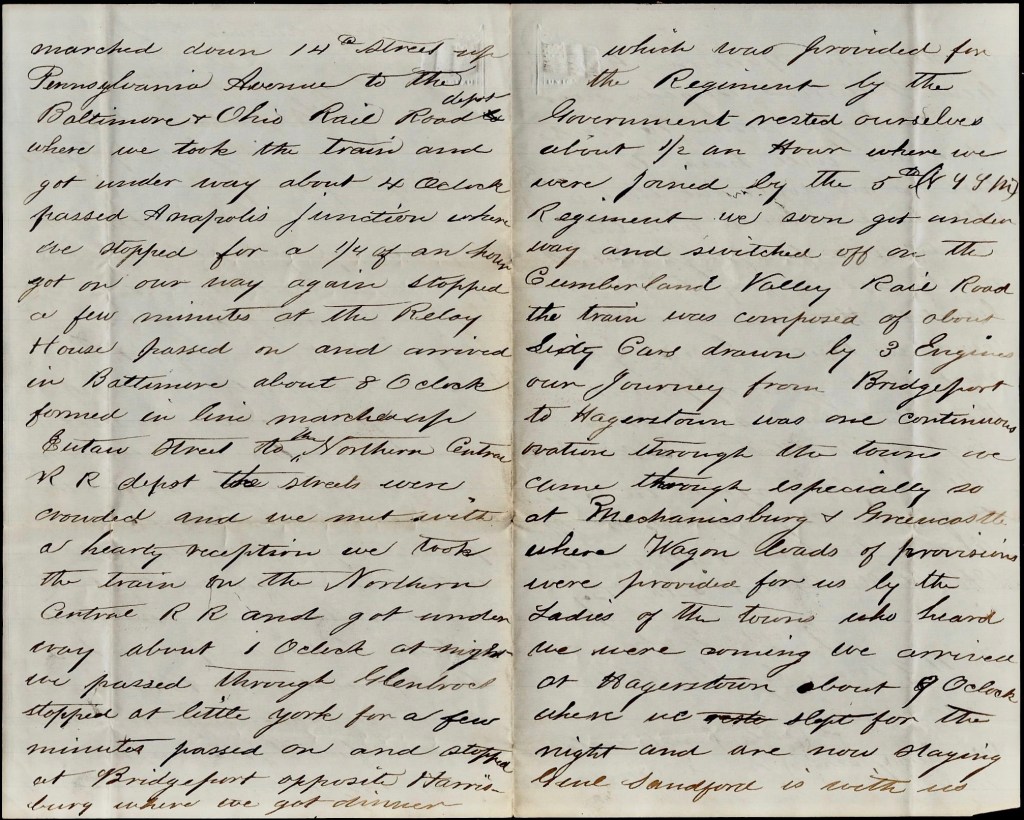 We soon got underway and switched off on the Cumberland Valley Railroad. The train was composed of about sixty cars drawn by three engines. Our journey from Bridgeport to Hagerstown was one continuous ovation through the towns we came through—especially so at Mechanicsburg and Greencastle where wagonloads of provisions were provided for us by the ladies of the towns who heard we were coming. We arrived at Hagerstown about 9 o’clock where we slept for the night and are now staying.
