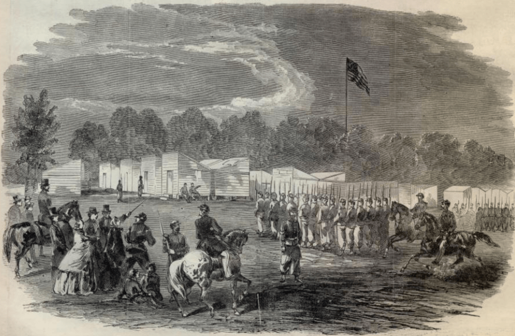 After the dress parade was over, our captain gave us orders to take off our dress suit and to put on our fatigue dress ready for a march. About nine o’clock we had orders to fill our canteens and pack up our knapsacks and at 10 o’clock we got our rations of bread and preserved meat for one day. Soon after we went to bed and about 12 o’clock when we were all to sleep, we were aroused out of our shanties and ordered to fall in with out knapsacks and belts on and with our muskets and in about ten minutes time we were on our march to the Sacred Soil of Virginia. The moon shone bright and the air was cool and bracing. It was a night long to be remembered by all the regiment and those that witnessed our departure.