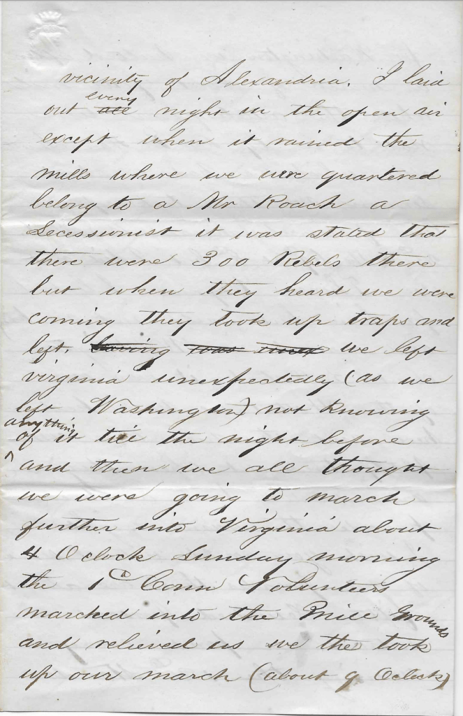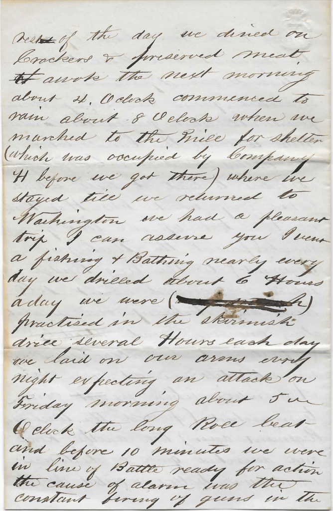 Awoke the next morning about 4 o’clock, commenced to rain about 8 o’clock, when we marched to the Mill for shelter (which was occupied by Company H before we got there) where we stayed till we returned to Washington. We had a pleasant trip, I can assure you. I went a fishing and bathing nearly every day. We were practiced in the skirmish drill several hours each day. We laid on our arms every night expecting an attack. On Friday morning about 5 o’clock, the long roll beat and before 10 minutes we were in line of battle ready for action. The cause of the alarm was the constant firing of guns in the vicinity of Alexandria. I laid out every night in the open air except when it rained. The Mills where we were quartered belong to a Mr. Roach—a secessionist. It was stated that there were 300 rebels there but when they heard we were coming, the took up traps and left.