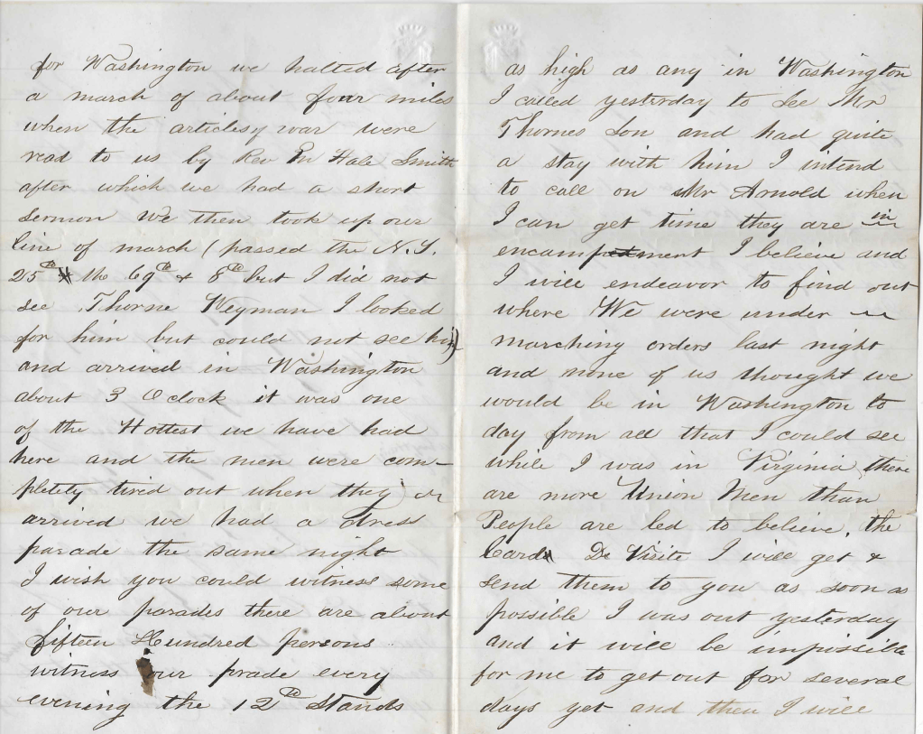 We left Virginia unexpectedly (as we left Washington) not knowing anything of it till the night before and then we all thought we were going to march further into Virginia. About four o’clock Sunday morning the 1st Connecticut Volunteers marched into the Mill grounds and relieved us. We then took up our march (about 9 o’clock) for Washington. We halted after a march of about four miles when the articles of war were read to us by Rev. [ ] Hale Smith after which we had a short sermon. We then took up our line of march (past the New York 25th, the 69th, & 8th but I did not see Thorne Weyman. I looked for him but could not see him, and arrived in Washington about 3 o’clock. It was one of the hottest [days] we have had here and the men were completely tired out when they arrived.