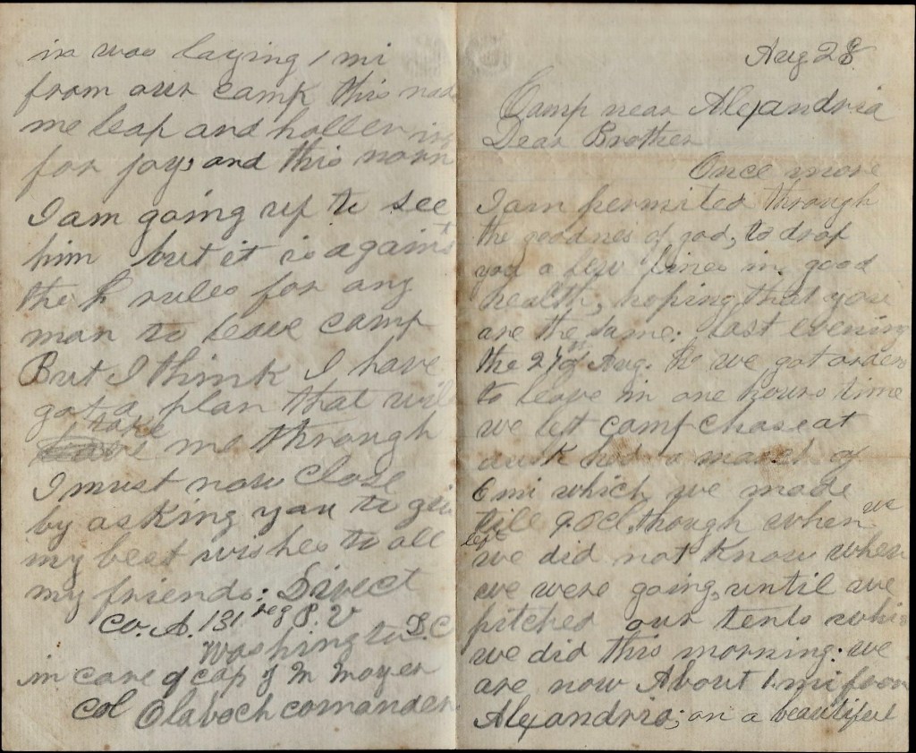 Once more I am permitted through the goodness of God to drop you a few lines in good health, hoping that you are the same. Last evening the 27th of August, we got orders to leave in one hours time. We left Camp Chase at dusk, had a march of 6 miles which we made till 9 o’clock, though we did not know where we were going until we pitched our tents which we did this morning. We are now about 1 mile from Alexandria on a beautiful sod and along the Potomac and at the side of the railroad.
