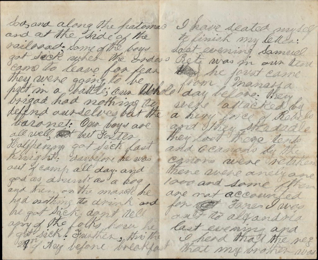 Further, this is the 29th of August before breakfast. I have seated myself to finish my letter. Last evening Samuel Betz was in our tent. He just came from Manassas day before. There were attacked by a heavy force of rebels and they skedaddled. The lost their tents and 6 cannons but the cannons were retaken. There were only one thousand and some of them are not accounted for.