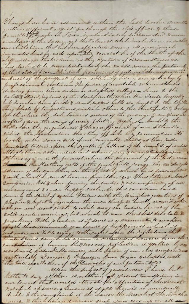 I still remain at the office of the old firm, Bebb & Reynolds. Things here have assumed within the last twelve months quite a different aspect for though the old office & those familiar objects by which I am immediately surrounded remain unaltered & the same, yet that almost total revolution, or rather annihilation that has been effected among its once jovial inmates has forced upon me the conviction of the truth of the old adage that man is the creature of circumstances. This seems to be more particularly the case among the fraternity of this old office…I stand almost companionless & alone forming the centre and circumference of our numerous and once happy circle. In this condition, bowed down by the spirit or ennui, I turn with the mingled emotions of pleasure and regret to gaze upon the once cheerful hearth around which we were wont to while away the leisure hours of the cold winter evenings; but which is now cheerless, desolate, and forsaken. With pleasure as it serves as a memento to awaken afresh those moments—yea hours—of happiness which it was once our lot to enjoy. With regret upon the reflection that those scenes can never again be renewed, I have the consolation of having the moody reflection dispelled by an occasional personal intercourse with some of our old companions—particularly Drayer and Ebenezer, known to you perhaps as well the trite appellation of the Eunuchs of our fraternity.