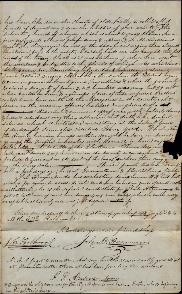 The Ohio elections of which I suppose you have already heard is cheering to the friends of law and order (the Whigs having a majority of 24 on joint ballot in the Legislature). The Whigs of our town and vicinity have had some capitol fun with the Locofocos here upon the occasion of our election last Tuesday. As an unusual occurrence here, there was little or nothing said about either men or measures previous to the election—at least in the ranks of the Whigs. Stokes as usual had been copious and pathetic in his appeals to the democracy (notwithstanding the silence of the Whigs) to turn out to a man and save the country from ruin. They came to the polls more than ordinarily elated with the reflection of their anticipated triumph. All went swimmingly on until about 2 o’clock p.m. when the Whigs, in pursuance of some preconcerted plan of a few who were fond of fun, came pouring in from all directions in such numbers as to terrify & utterly confound the Locofocos. Stokes broke gasping for breath for his office for a new supply of tickets. Oliver mounted a swhiched poney standing hard by and ere the shouts of hurrah boys, or, “By God we are beaten!” had died upon the breeze might be seen sending his way at the top of his cargers speed for the black bottours and Wilkins vociferated “To arms! to arms! The Coons [Whigs] are upon us in an unguarded moment,” while upon the opposite corner of the Public Square might be heard as the echoes of his lion-like voice, the shouts of Old Rolly to rally! “Rally! friends of democracy & save the liberties of your country from the subverting hands of whiggery which is about to grasp them.” In a few moments, all was confusion & uproar, and in all directions might be seen the dismayed leaders of the Locofocos urging their almost bewildered serfs to the onset.