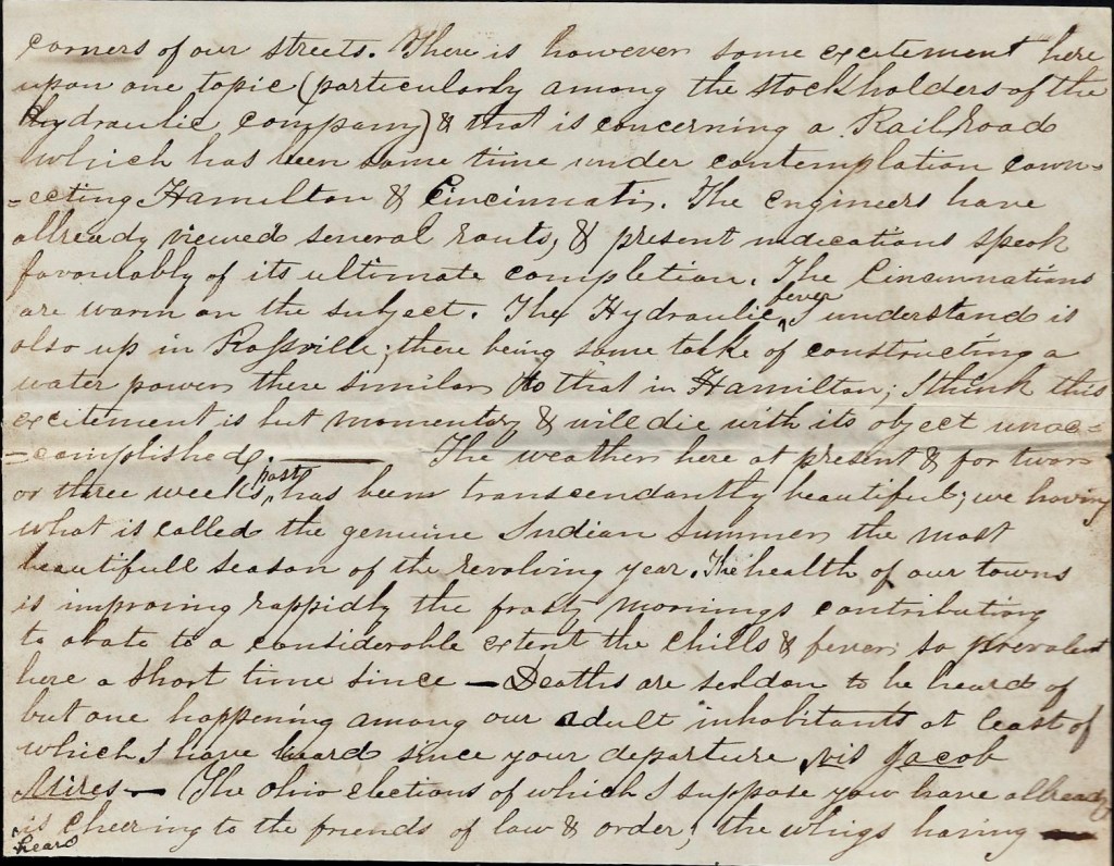 There is, however, some excitement here upon one topic (particularly among the stockholders of the Hydraulic company) & that is concerning a railroad which has been some time under contemplation connecting Hamilton and Cincinnati. The engineers have already viewed several routes, & present indications speak favorably of its ultimate completion. The Cincinnatians are warm on the subject. The Hydraulic fever, I understand, is also up in Rossville; there being some talk of constructing a water power there similar to that in Hamilton. I think this excitement is but momentary & will die with its object unaccomplished. 1