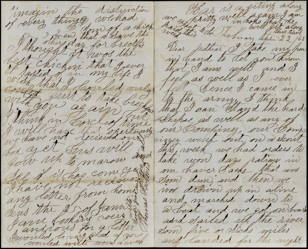 Thomas wrote the following letter in February 1863 while the regiment was on duty in Memphis, Tennessee. From there they would occasionally go out on scouts, looking in particular for bushwhackers who would fire on Union ships as they carried troops and materials up and down the Mississippi. The “little town” that Thomas describes having seen “in ashes” was most likely the village of Hopefield which Major General Stephen A. Hurlbut, commander of the 16th Army Corps headquartered at Memphis, ordered to be destroyed as he judged it to be “a mere shelter for guerrillas” who had attacked Union boats for several weeks above and below Memphis. It was destroyed on 19 February 1863.