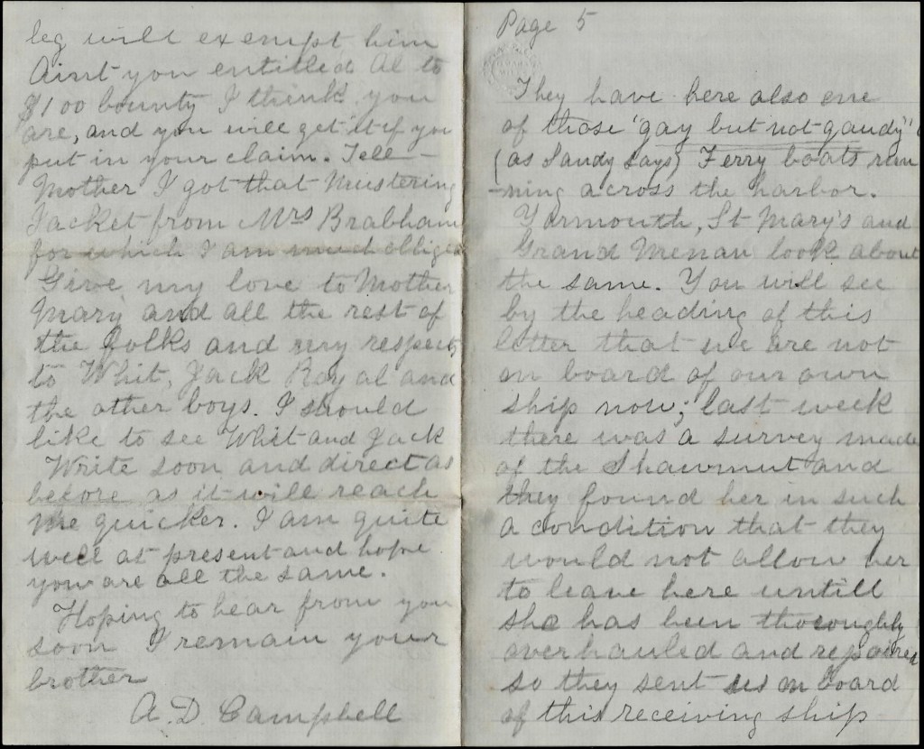 On this ship, it is quiet but it is very cold. We have had a foot of snow here already and it looks like more coming. I don’t know how long we shall be here—some say two or three weeks and others two or three months. But I would rather be on board of my own ship. You want to know if there is any chance to get on the Shawmut. Take my advice and stay ashore. I think you have had enough of Uncle Sam and if the draft takes place and you are caught, why “skedad.” Tell Jack he need not be afraid of the draft for his leg will exempt him.  Ain’t you entitled, Al, to $100 bounty. I think you are, and you will get it if you put in your claim.