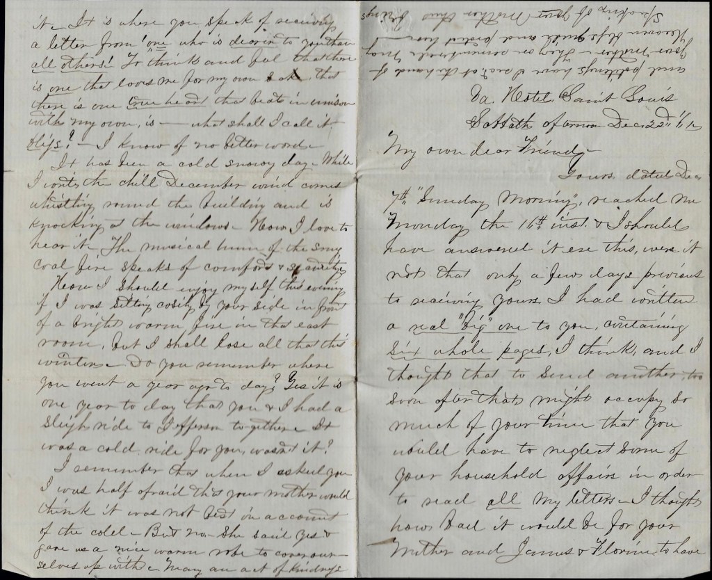 …It has been a cold, snowy day. While I write, the chill December wind comes whistling round the building and is knocking at the windows. How I love to hear it. The musical hum of the snug fire speaks of comfort and security. How I should enjoy myself this evening if I was sitting cosily by your side in front of a bright, warm fire in that east room…