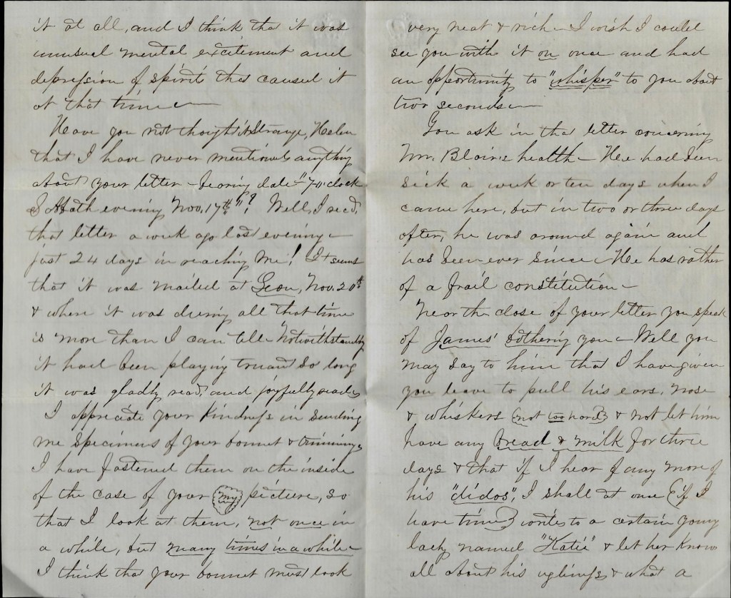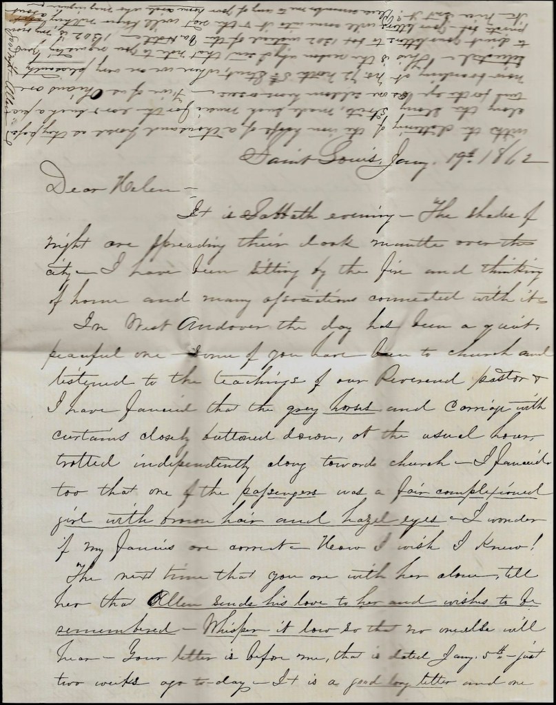 It is Sabbath evening—the shades of night are spreading their dark mantle over the city. I have been sitting by the fire and thinking of home and many associations connected with it. In West Andover the day has been a quiet, peaceful one. Some of you have been to church and listened to the teachings of our Reverend pastor & I have fastened that the grey horse and carriage with curtains closely buttoned down at the usual hour trotted independently along towards church. I fancied too that one of the passengers was a fair complexioned girl with brown hair and hazel eyes. I wonder is my fancies are correct. How I wish I knew!…