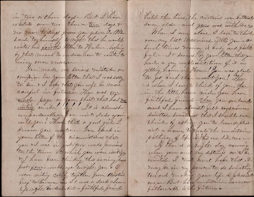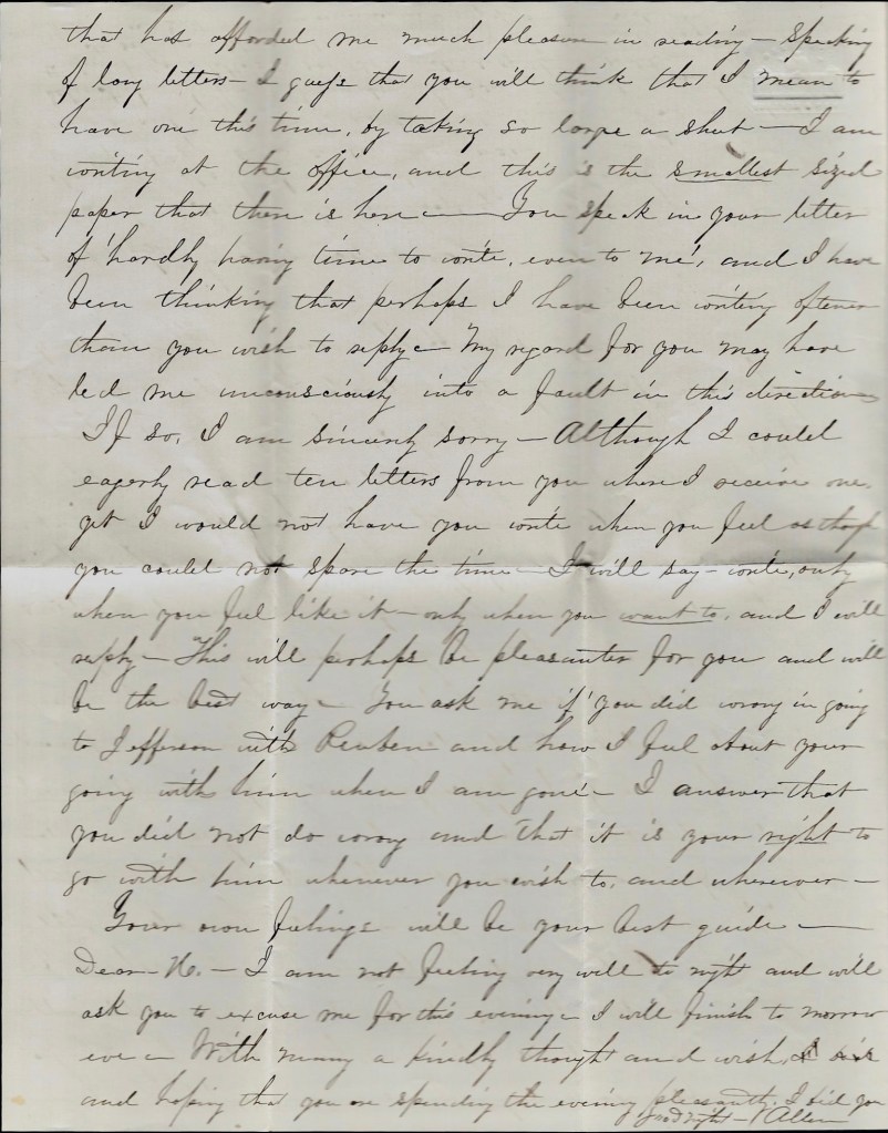 You speak in your letter of the circumstances that you and I were in just two weeks previous to the time at which you were writing and i have been thinking this evening how just four weeks ago tonight you and I were riding cosily together from Austinbury to Geneva. It was a dark, cheerless night indeed but a faithful friend held the lines, the curtains were buttoned down close, and you was with me. When I am alone, I love to think over my last interview with you at such times. emory is busy and faithful…