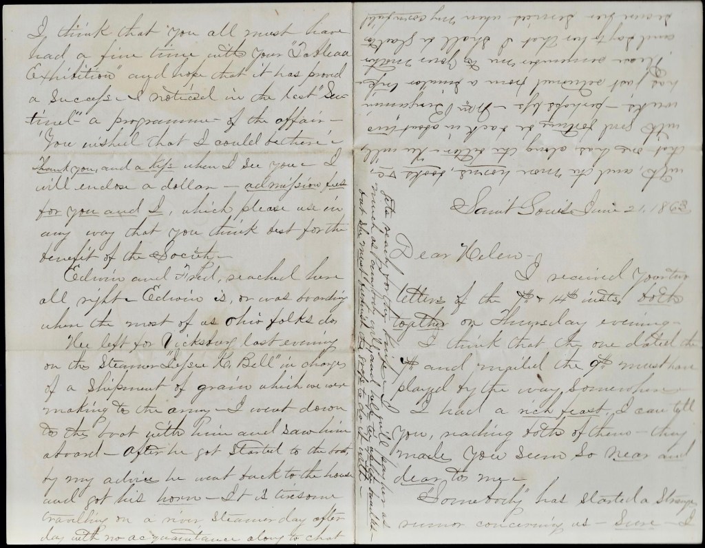 Edwin and Fred reached here all right. Edwin is, or was boarding where the most of us Ohio folks do. He left for Vicksburg last evening on the Steamer Jesse K. Bell 1 in charge of a shipment of grain which we were making to the army. I went down to the boat with him and saw him aboard. After he got started to the boat, by my advice he went back to the house and got his horn. It is tiresome traveling on a river steamer day after day with no acquaintance along to chat with and the more horns, books, &c. that one has along the better. He will, with good fortune, be back in about two weeks—perhaps less.