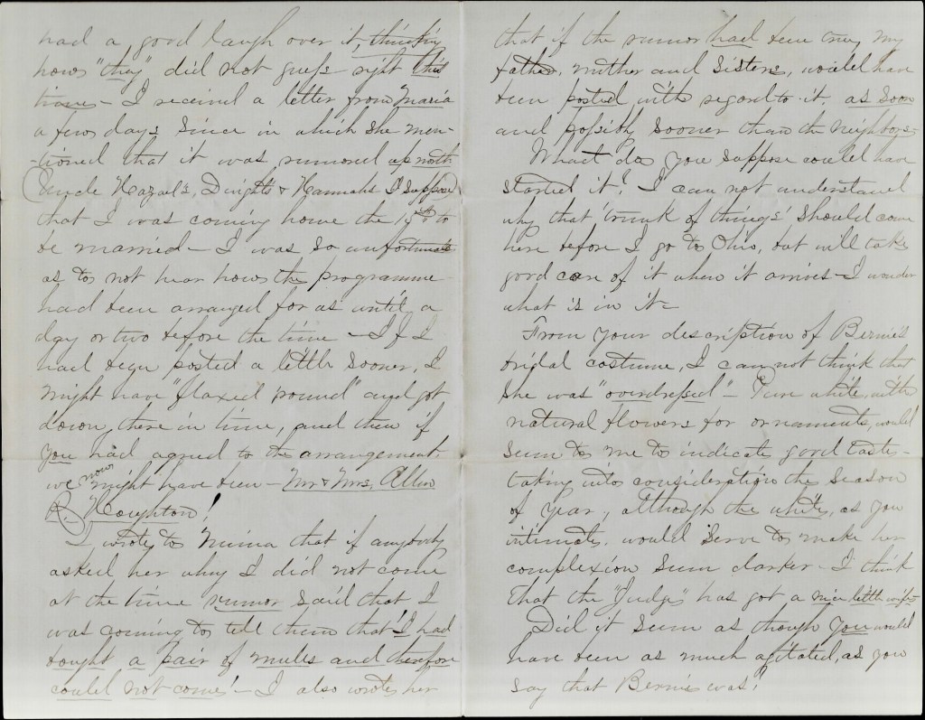 I received your two letters of the 7th and 14th insts. both together on Thursday evening…I had a rich feast I can tell you reading both of them. They made you seem so near and dear to me. Somebody has started a strange rumor concerning us—sure—I had a good laugh over it, think how “they” did not guess right this time….