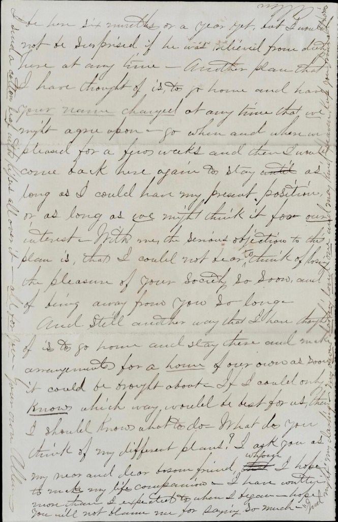 Dear friend, there is one subject that has been on my mind for the last few months a great deal of time. I want to have you something more than a friend—to call you by a nearer and dearer name—wife. I confess to you, as my bosom friend, that I am sometimes perplexed as to where the time shall be that we may choose for our nuptials. If I was sure of staying here any length of time, I have thought that I would ask that we might be married and that you come here and be with me. The Captain may be here six months or a year yet, but I would not be surprised if he was relieved from duty here at any time….