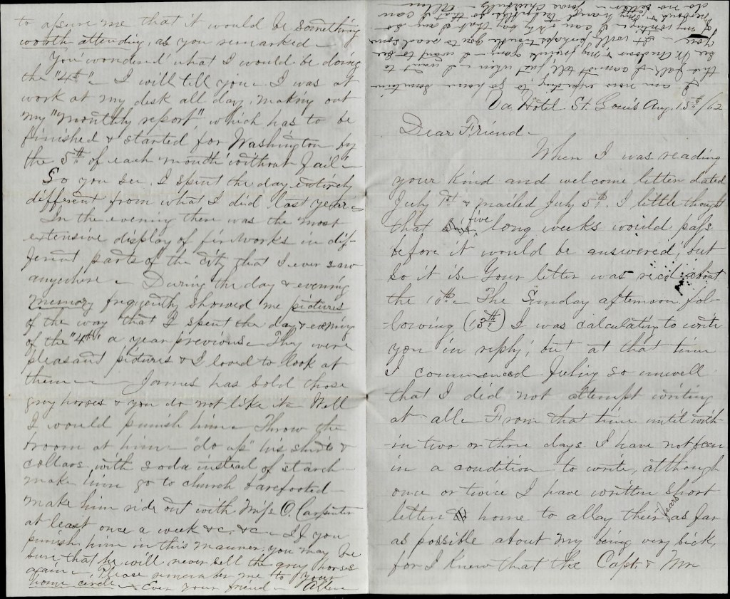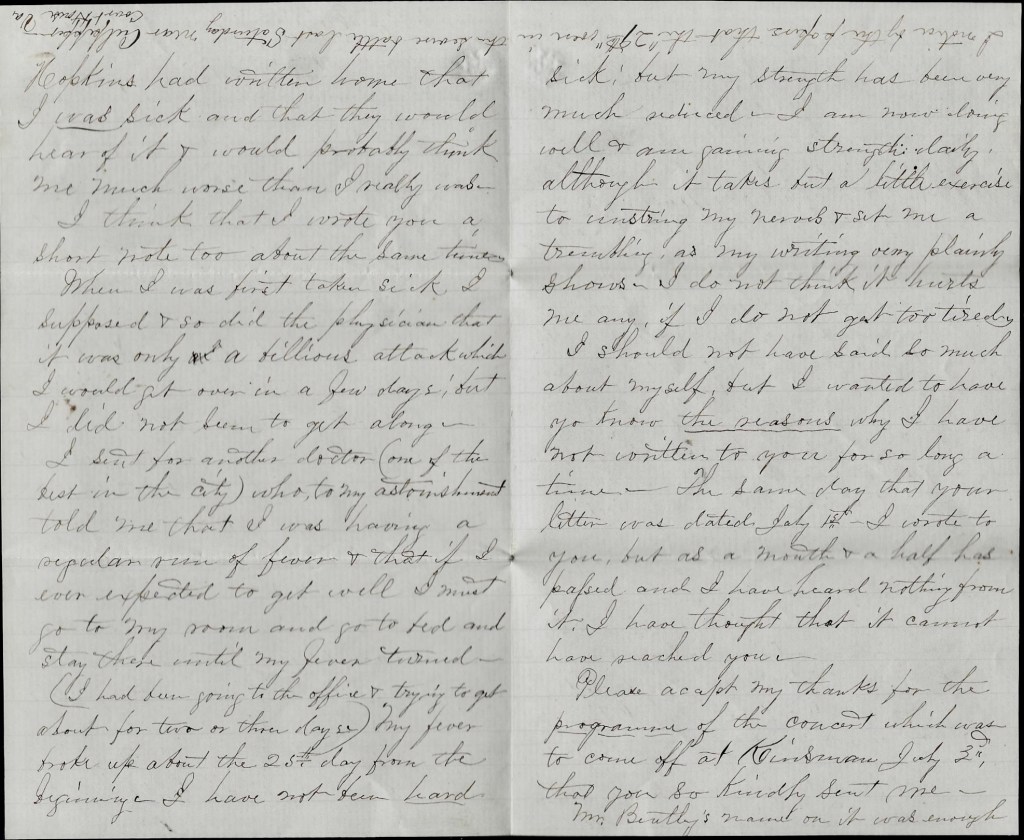 When I was reading your kind and welcome letter dated July 1st and mailed July 5th, I little thought that five long weeks would pass before it would be answered but so it is. Your letter was received about the 10th. The Sunday afternoon following (13th) I was calculating to write you in reply but at that time I commenced feeling so unwell that I did not attempt writing at all. From that time until within two or three days, I have not been in a condition to write although once or twice I have written short letters home to allay their fears as far as possible about my being sick for I knew that the Capt. and Mrs. Hopkins had written home that I was sick and that they would hear of it & would probably think me much worse that I really was…My fever broke up about the 25th day from the beginning. I have not been hard sick, but my strength has been very much reduced. I am now doing well & am gaining strength daily…