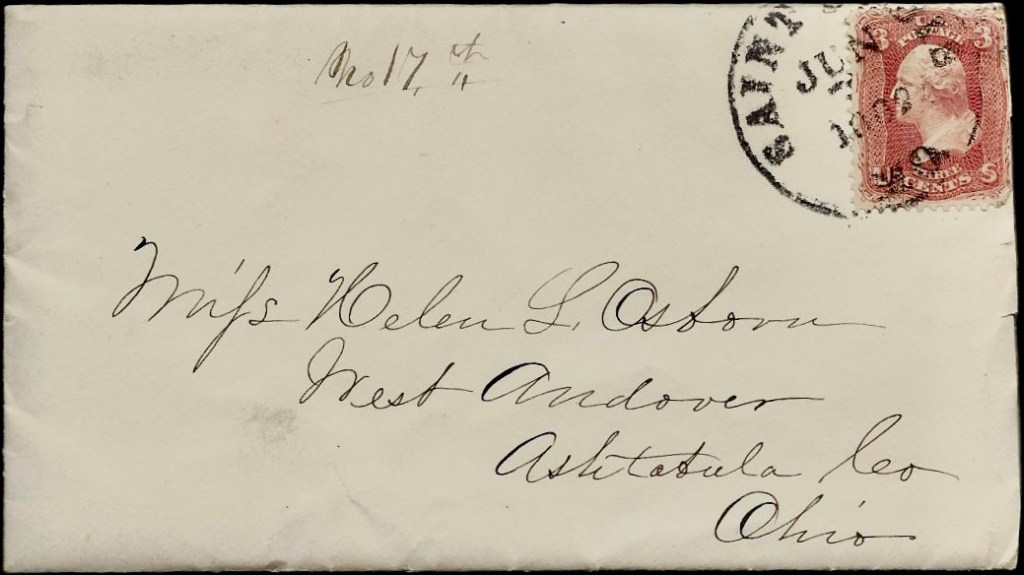 The following letters were written by Allen Rufus Houghton (1832-1884), the son of Rufus Houghton (1796-1882) and Jane Bates (1805-1889) of Ashtabula county, Ohio. In the 1860 US Census, Allen was enumerated in his parents household in West Andover as a 27 year-old “Clerk.” By 1870, Allen was married to Helen Lucinda Osborn (1842-1912) and living in Jefferson, Ashtabula county as a “carpet dealer.” Allen and Helen were married on 15 June 1865 in Andover. It does not appear that Allen ever served in the military.