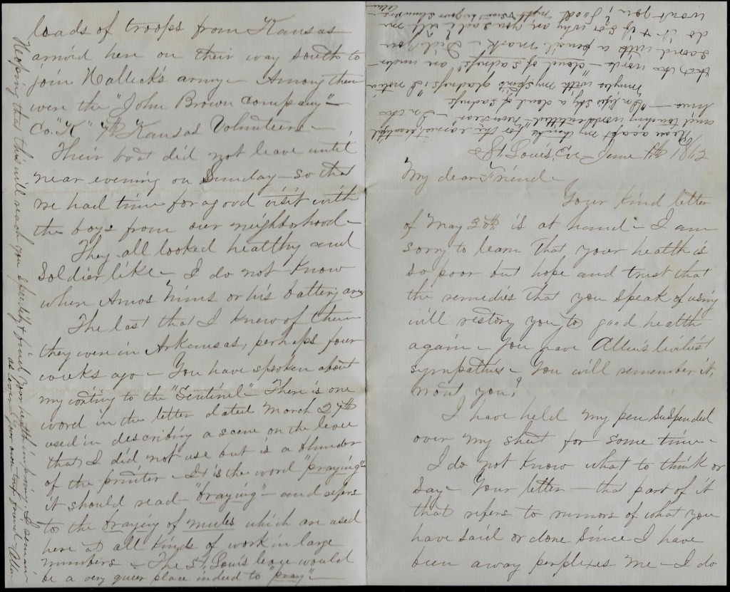 Last Saturday, several steamer loads of troops from Kansas arrived here on their way south to join Halleck’s army. Among them were the “John Brown Company”—Co. K, 7th Kansas Volunteers. Their boat did not leave until near evening on Sunday so that we had time for a good visit with the boys from our neighborhood. They all looked healthy and soldier like. I do not know where Amos Nims or his Battery are. The last that I knew of them, they were in Arkansas, perhaps four weeks ago.