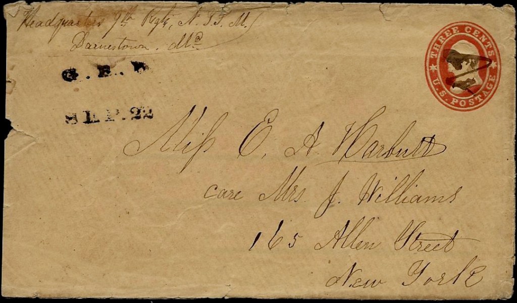 Return address on envelope reads: Headquarters 9th Regt. N. Y. S. M, Darnestown, Md.