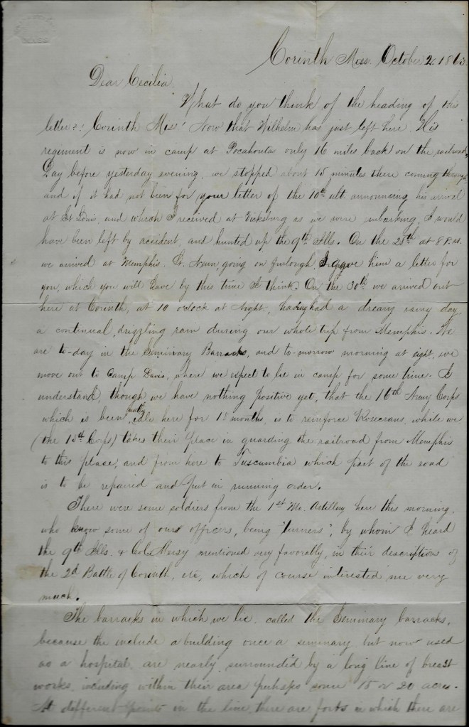 What do you think of the heading of this letter?! Corinth, Miss! Now that Wilhelm has just left here, his regiment is ow in camp at Pocahontas only 16 miles back on the railroad. Day before yesterday evening, we stopped about 15 minutes there coming through and if it had not been for your letter of the 10th ult. announcing his arrival at St. Louis, and which I received at Vicksburg as we were embarking, I would have been left by accident and hunted up the 9th Illinois. On the 28th at 8 p.m. we arrived at Memphis. Lt. Neun, going on furlough, I gave him a letter for you which you will have by this time I think. On the 30th, we arrived out here at Corinth at 10 o’clock at night, having had a dreary, rainy day—a continual. drizzling rain during our whole trip from Memphis. We are today in the Seminary Barracks and tomorrow at light we move out to Camp Davis where we expect to lie in camp for some time. I understand, though, we have nothing positive yet that the 16th Army Corps, which has been mostly idle here for 18 months, is to reinforce Rosecrans while we (the 1st Corps) takes their place in guarding the railroad from Memphis to this place, and from here to Tuscumbia which part of the road is to be repaired and put in running order.