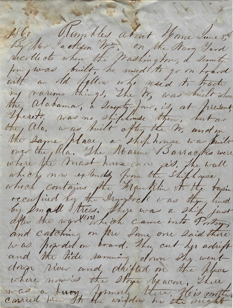 There was a ship just after the War of 1812 which came into Portsmouth and catching on fire, someone said there was powder on board. They cut her adrift and the tide running down, she went down river and drifted on the place where now is the stone beacon. There was a buoy formerly there. His mother carried him to the window in the night. The ship was burned in the night. She was loaded with hemp. The place now having the red beacon over it was called Pumpkin Island because it was wholly planted with pumpkins by old Mother Shaw. The Huckleberry Island was also much larger but is now washed away on the eastern part of this shipyard and Samuel Badger’s great grandmother Fernald said she picked huckleberries on the part extending from Mr. Jackson’s house to the water.