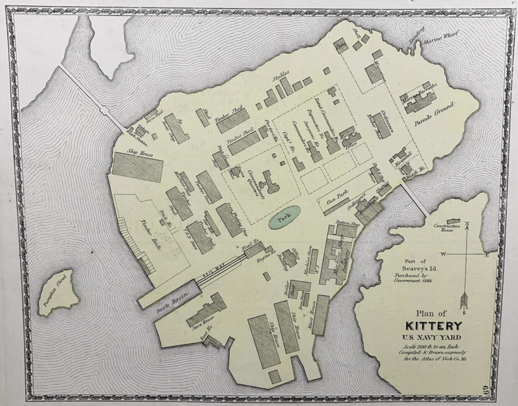 It is said that the Indians used to go to the shoals. The Indians used to come up by the Portsmouth bridge, a hundred at a time, and steal everything. The America was built at Badger’s Island in 1690. The Falkland, 54 guns, was built here by order of the British government, and this place was selected as a naval depot prior to the Revolution. At this yard was the Ranger was built, commanded by John Paul Jones. The frigates Congress, Crescent, and Portsmouth of 24 guns were built here prior to 1799. The Washington, 74 guns, in 1814. Schooner Porpoise in 1820. Sloop Concord, 24 guns, in 1828. Sloop Preble, 16 guns, in 1839.