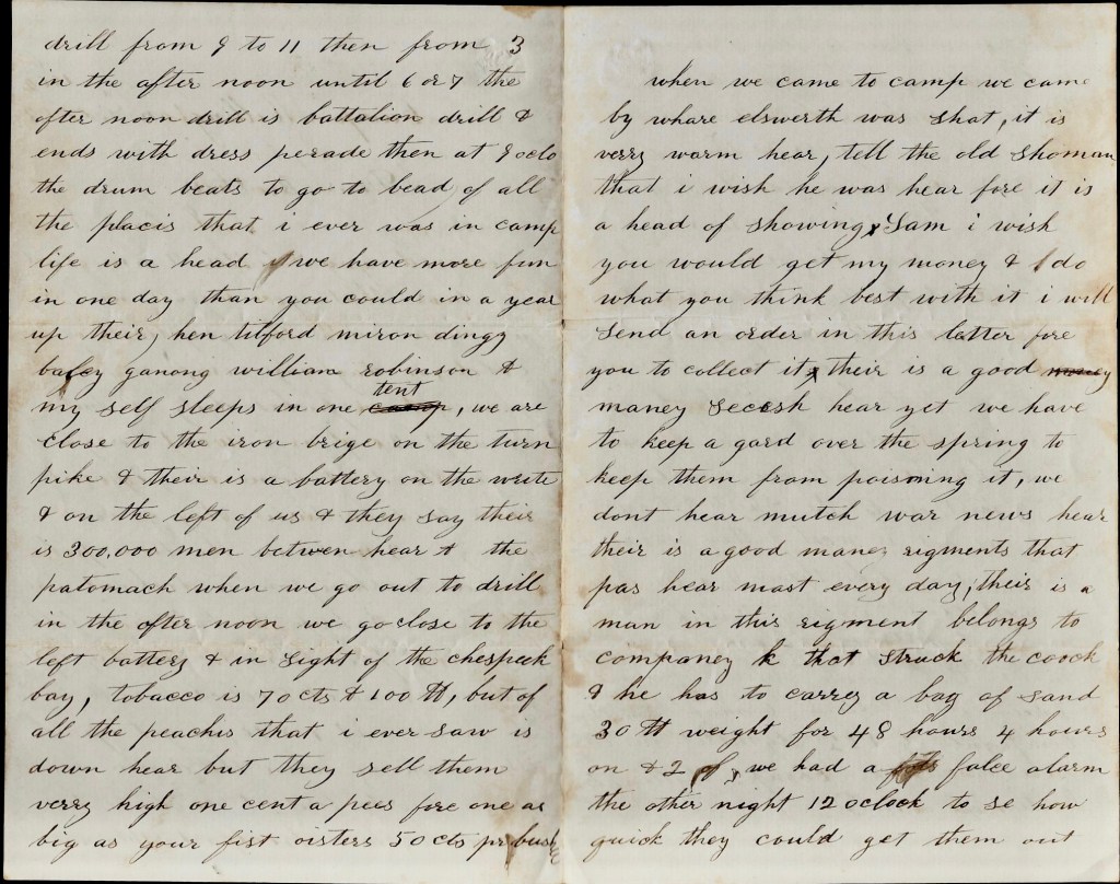 [William] Hen[ry] Tilford, Myron Dingee, Bailey Ganung, William Robinson, & myself sleeps in one tent. We are close to the iron bridge on the turnpike & there is a battery on the right and on the left of us & they say there is 300,000 men between here and the Potomac. When we go out to drill in the afternoon, we go close to the left battery & in sight of the Chesapeake Bay,