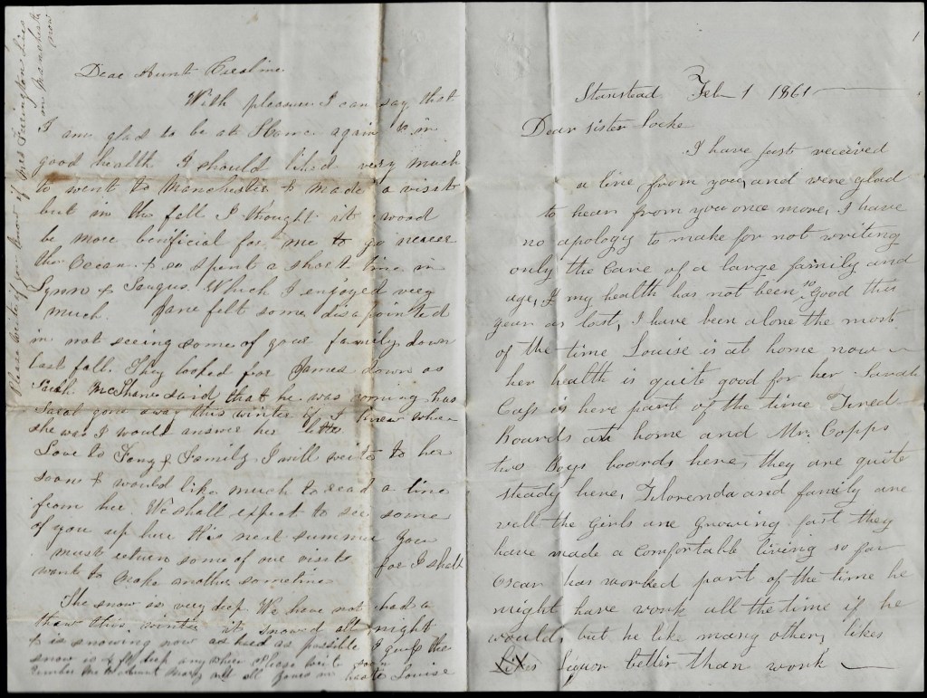 This letter was written by Sarah (Cass) Locke (1805-1884), the wife of James Munroe Locke (1804-1862) of Stanstead, Quebeck, Canada—just across the border from Vermont. She wrote the letter in February 1861 to her sister-in-law, Caroline Dame (Tibbetts) Locke (1809-1893)—the wife of Rev. William Sherburne Locke (1808-1896). Caroline was the daughter of William S. Tibbetts (1780-1857) and Jerusha Dame (1784-1820) of Kittery, Maine. Caroline’s husband, William, was enumerated as a retired Methodist minister in Manchester, Hillsborough county, New Hampshire, in 1860. He was born in Stanstead.