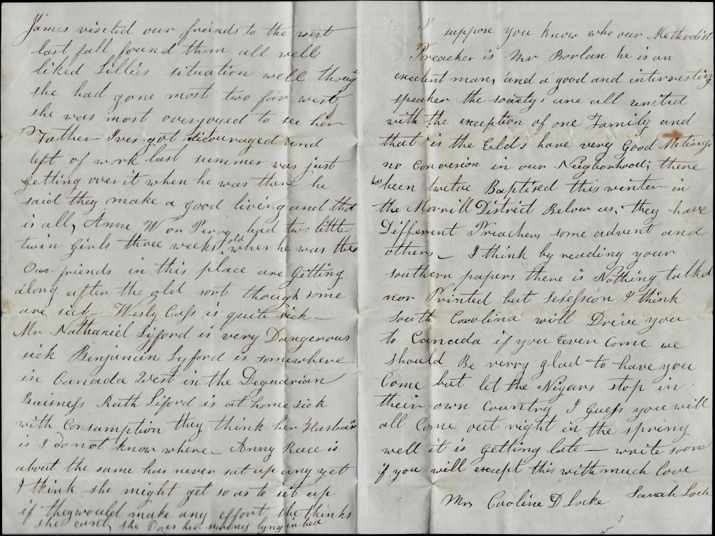Most of the letter consists of family chit-chat but one paragraph in particular contains an item of historical interest. It reads: “I think by reading your southern papers there is nothing talked nor printed but secession. I think South Carolina will drive you to Canada. If you ever come, we should be very glad to have you come but let the niggers stop in their own country.” Apparently not all of Canada awaited the emigration of Blacks with open arms.