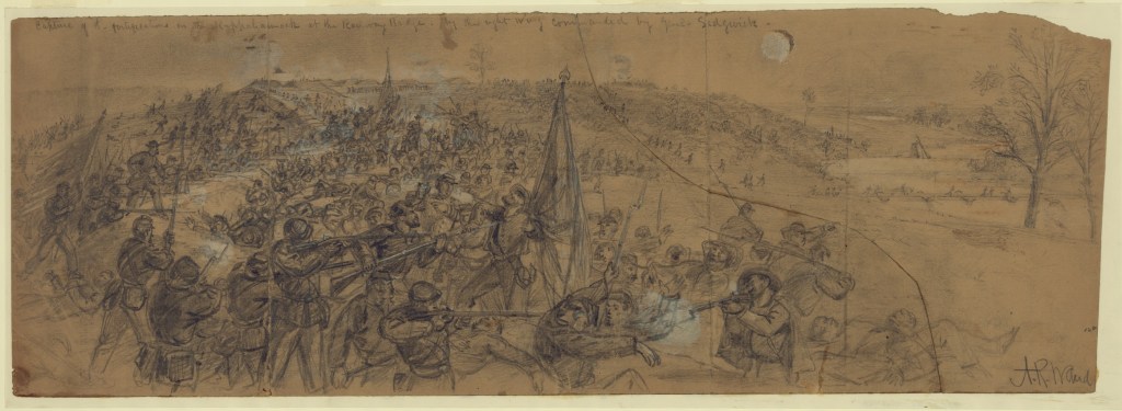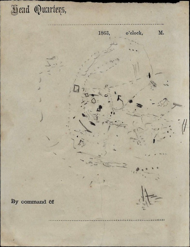 Richards’ letter contains a brief reference to the surprise attack at dusk on Saturday, 7 November 1863, in which the Union army forced their way across the Rappahannock and overran the Confederate bridgehead at Rappahannock Station, capturing about 1,600 Confederates, and forcing the balance of Lee’s army to retreat below the Rapidan river. This engagement is sometimes referred to as Rappahannock Station II. Richards’ letter also includes a rather crude hand-drawn map.