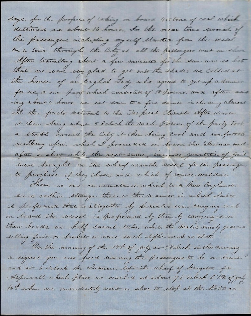 On the 13th of July we arrived at Kingston, Island of Jamaica, after a pleasant voyage of 7 days, for the purpose of taking on board 400 tons of coal which detained us about 16 hours. In the meantime several of the passengers including myself started from the vessel on a tour through the city as all the passengers went on shore. After traveling about a few minutes—for the sun was so hot that we were glad to get into the shade—we called at the house of an English lady who agreed to get up a dinner for us, or our party which consisted of 18 persons, and after waiting about four hours, we sat down to a fine dinner including almost all the fruits natural to the tropical climate.