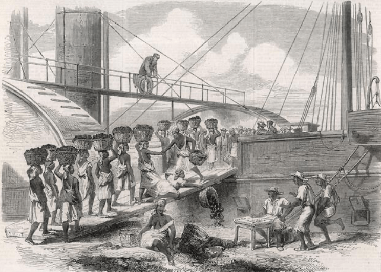 One of the more curious observations made by Wallace during this journey occurred when their steamer stopped in Kingston, Jamaica, to take on a load of coal. “There is one circumstance which to a New Englander seems rather strange [and] that is the manner in which labor is performed. That is [done] altogether by females—even carrying coal on board the vessel is performed by them by carrying it on their heads in half barrel tubs, while the males merely go around selling fruit or baskets or some such light work as that.”