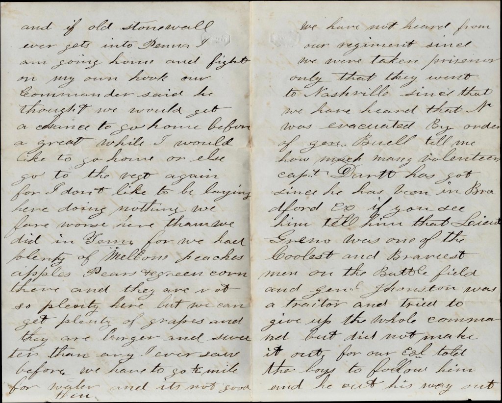 We have not heard from our regiment since we were taken prisoners—only that they went to Nashville. Since that, we have heard that Nashville was evacuated by order of Gen. Buell. Tell me how many volunteers Capt. [Benjamin S.] Dartt has got since he has been in Bradford County. If you see him, tell him that Lieut. [Charles L.] Green was one of the coolest and bravest men on the battlefield and General [Richard Woodhouse] Johnson was a traitor and tried to give up the whole command but did not make it out for our Colonel [George C. Wynkoop] told the boys to follow him and he cut his way out, but not until Gen. Johnson had surrendered. 1