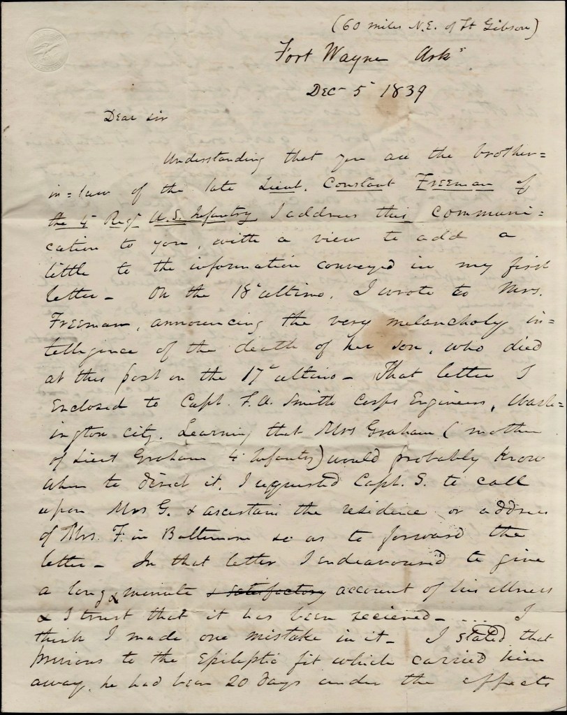 In this letter to the deceased’s brother-in-law, Lieutenant Benjamin Alvord is following up on a previous communication regarding the death of Lieutenant Constant Freeman, 4th Regiment U.S. Infantry. Freeman was a graduate of the West Point Class of 1838 who was commissioned a 2nd Lieutenant and who died on duty at Ft. Wayne in Indian Territory on 17 November 1839.