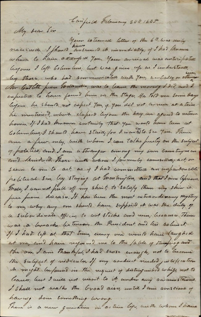 If I had known certainly that you would have been at Columbus, I should have stayed for I wanted to see you. There are a few only with whom I can talk freely on the subject of politics and I am a stranger among my own countrymen and kindred. Those with whom I formerly counseled, act, or seem to me to act, as if I had committed an unpardonable political sin by staying at Washington and that I am leprous. Well, I cannot pull of my shirt to satisfy them my skin in free from disease. It has been the most extraordinary mystery to me why anyone should have supposed it was the duty of a subordinate officer to cut sticks and run because there was a breach between the President and his cabinet. If I had left at that time, everyone would have laughed at me and have compared me to the fable of the frog and the owl. If my conduct needed justification, it might be found in the request of distinguished Whigs not to leave, but I will not resort to it, under any circumstances. I shall not walk the broad aisle until I am conscious of having done something wrong.