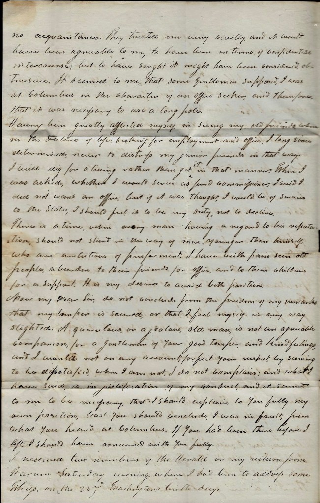 Now, my dear sir, do not conclude from the freedom of my remarks that my temper is soured or that I feel myself in any way slighted. A querulous or a jealous old man is not an agreeable companion for a gentleman of your good temper, and kind feelings, and I would not on any account forfeit your respect by seeming to be dissatisfied when I am not. I do not complain and that I have said is in justification of my conduct, and it seemed to me to be necessary that I should explain to you fully my own position least you should conclude I was in fault from what what you heard at Columbus. If you had been there before I left, I should have conversed with you fully.