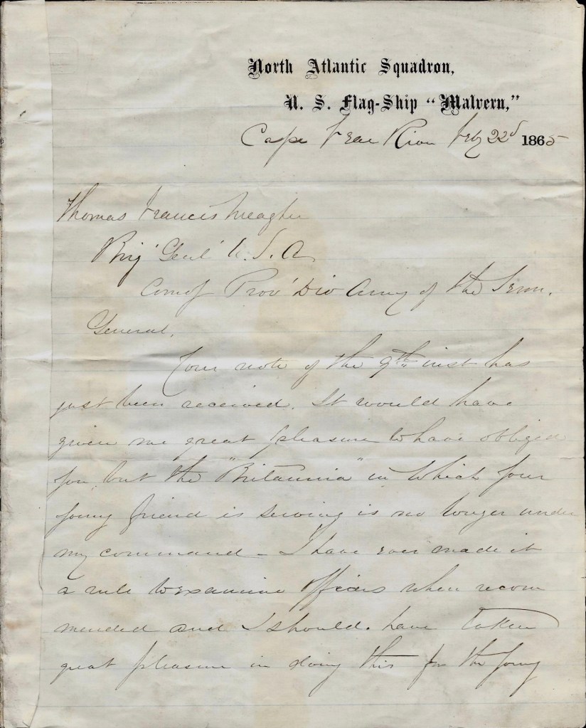 The following letter appears to have been dictated by, and signed by, Rear Admiral David Dixon Porter in answer to a letter received from Brig. Gen. Thomas Francis Meagher (1823-1867)—the famed former commander of the Irish Brigade. By this time of the war, Meagher was in command of the Provisional Division of the Army of the Tennessee and had recently joined forces with Sherman’s army in North Carolina.