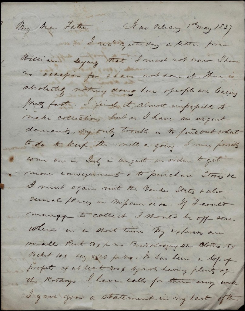 James’s letter was written during the Panic of 1837 and is the reason that business was “dull” and resulting in numerous financial embarrassments to businessmen. Jackson’s veto of a National Bank was also the cause of differences in valuation of money which lead to speculators playing State banks against each other, as mentioned in the closing paragraph.