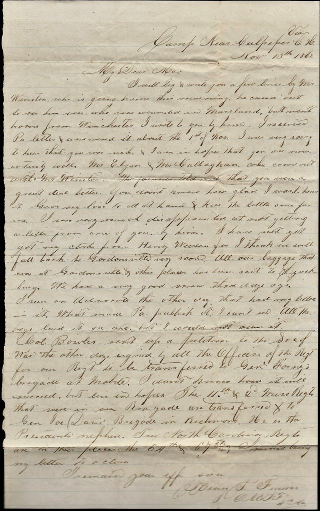 I will try and write you a few lines by Mr. Winston who is going home this morning. He came out to see his son who was wounded in Maryland, but went home from Winchester. 1 I wrote to you by him. I received Pa’s letter & answered it about the 1st of November. I was very sorry to hear that you was sick & I am in hopes that you are now entirely well. Mr. Elyin & McCallaghan came out with Mr. Winston. The former told me that you were a great deal better. You don’t know how glad I was to hear it. Give my love to all at home & kiss the little ones for me. I was very much disappointed in not getting a letter from one of you by him.