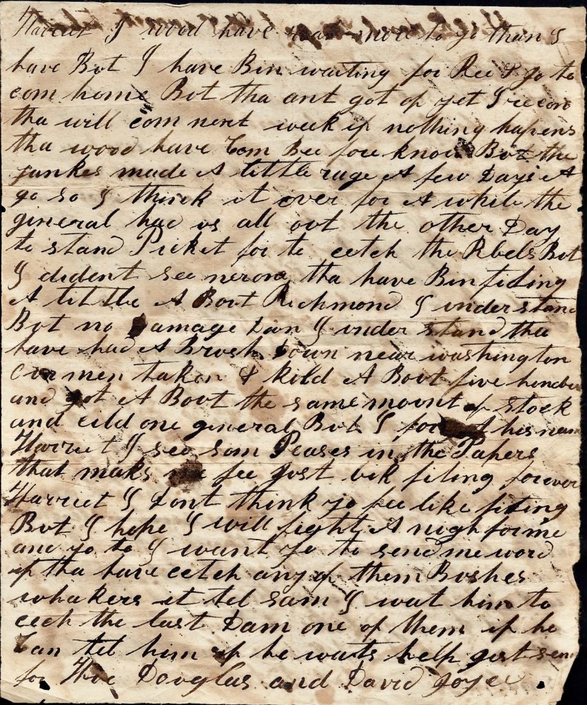 Harriet, I would have [ ] now to you than I have but I have been waiting for Ree & Joe to come home. But they ain’t got off yet. I reckon they will come next week if nothing happens. They would have come before now but the Yanks made a little raid a few days ago so I think it’s over for awhile. The General had us all out the other day to stand picket for to catch the Rebels but I didn’t see nery one. They have been fighting a little about Richmond, I understand, but no damage done. I understand they have had a brush down near Washington. Our men [have] taken and killed about five hundred and got about the same amount of stock and killed one general but I forgot his name.