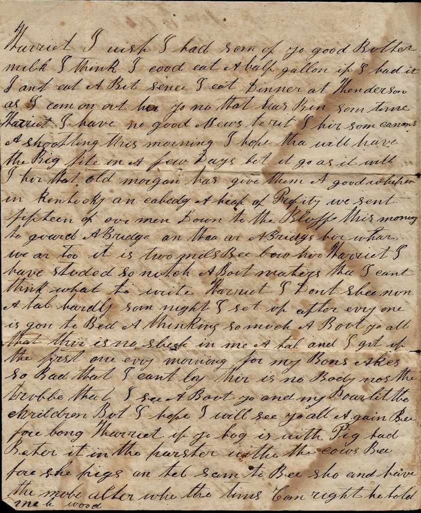 Harriet, I have no good news to write. I hear some cannons a shooting this morning. I hope they will have the big fight in a few days, let it go as it will. I hear that Old Morgan has given them a good whipping in Kentucky and captured a heap of property. We sent fifteen of our men down to the Bluff this morning to guard a bridge and there are a bridge here where we are too. It is two miles below here.