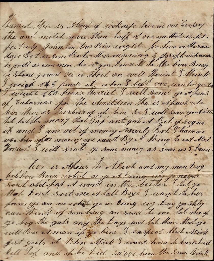 Harriet, if your hog is with pig, had better put it in the pasture with the cows before she pigs. And tell Sam to be sure and have the [ ] like he told me he would. Harriet, there is a heap of sickness here in our company. There ain’t much more than half of our men that is fit for duty. Johnson has been sick for two or three days but is some better this morning. Joseph Richardson is well as common. He is gone down to the boat bridge to stand guard. He has stood it well.